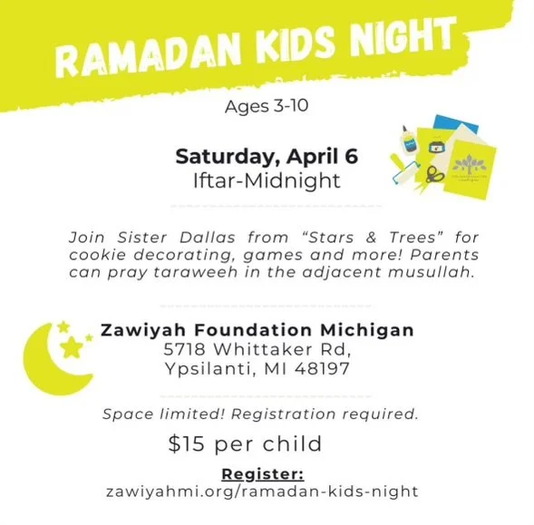Join Sister Dallas from the Stars and Trees studio for a Ramadan evening filled with fun for the kids! Don’t miss out on cookie decorating, games, and more! Parents can pray the taraweeh prayers in the adjacent musalah.